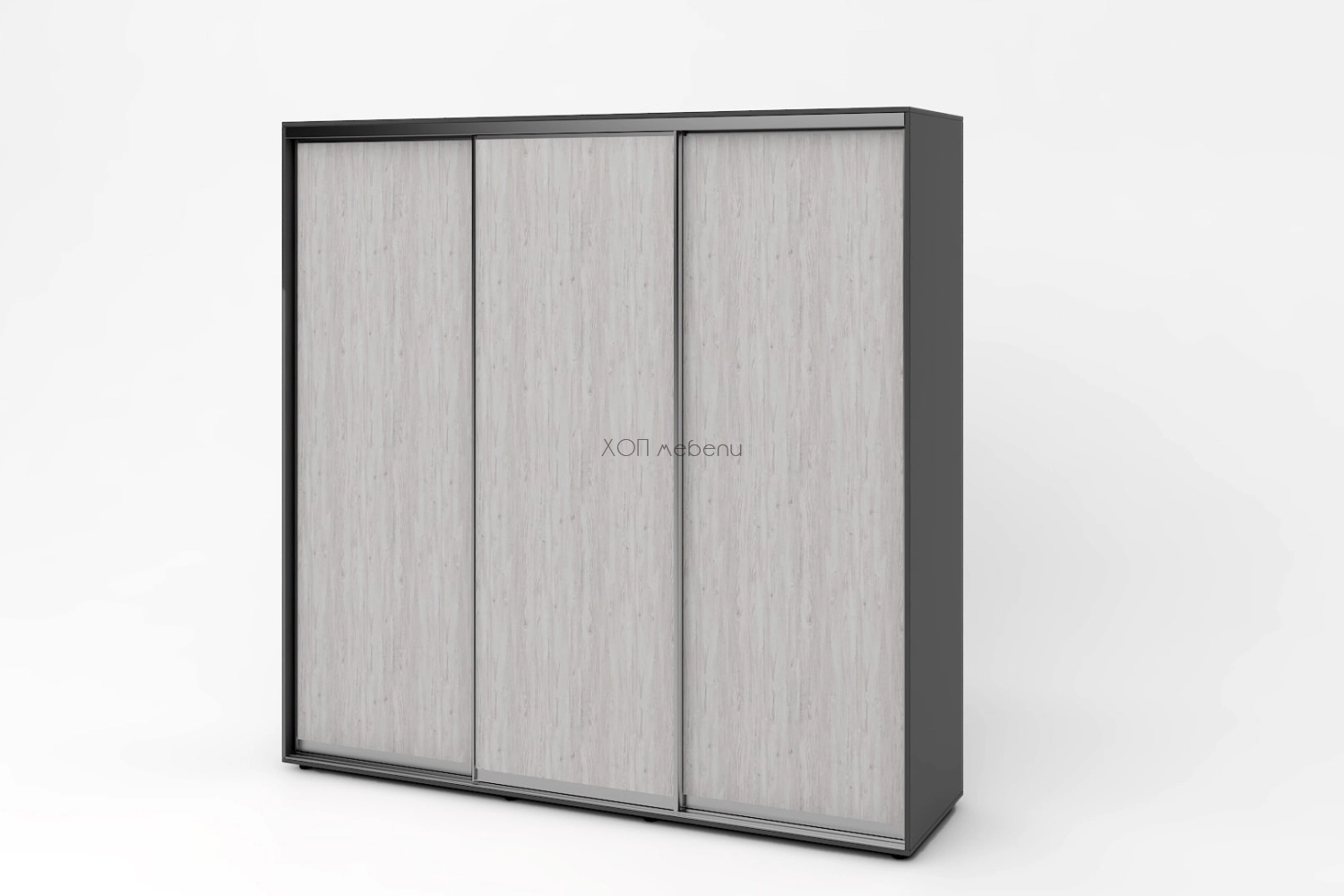 Тази конфигурация на гардероб Алфа е с корпус в графит и с три плътни врати в артууд.