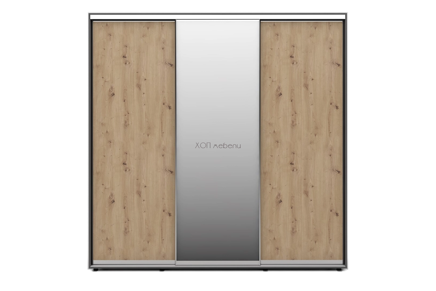 Тази конфигурация на гардероб Алфа е с корпус в цвят графит, с две плътни врати в артисан. Има и една огледална врата.