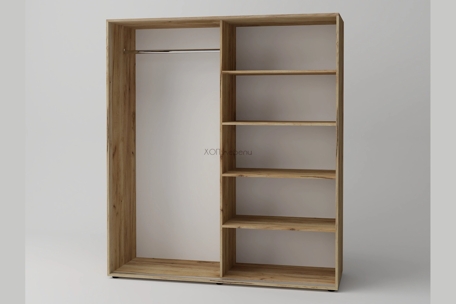 С лост за закачалки от едната страна и четири големи рафта от другата.