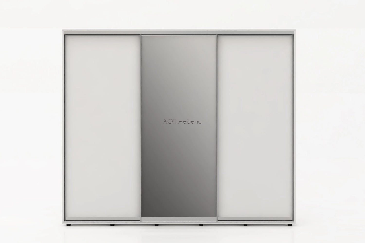 Тази конфигурация на гардероб Алфа е в цвят бяло с две плътни и една огледална врата.