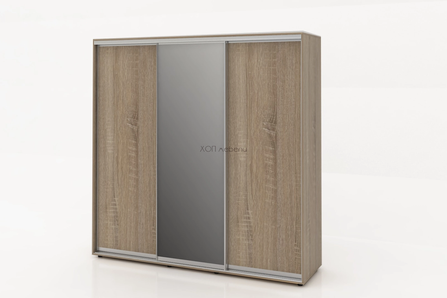 Тази конфигурация на гардероб Алфа е в цвят сонома с две плътни и една огледална врата.