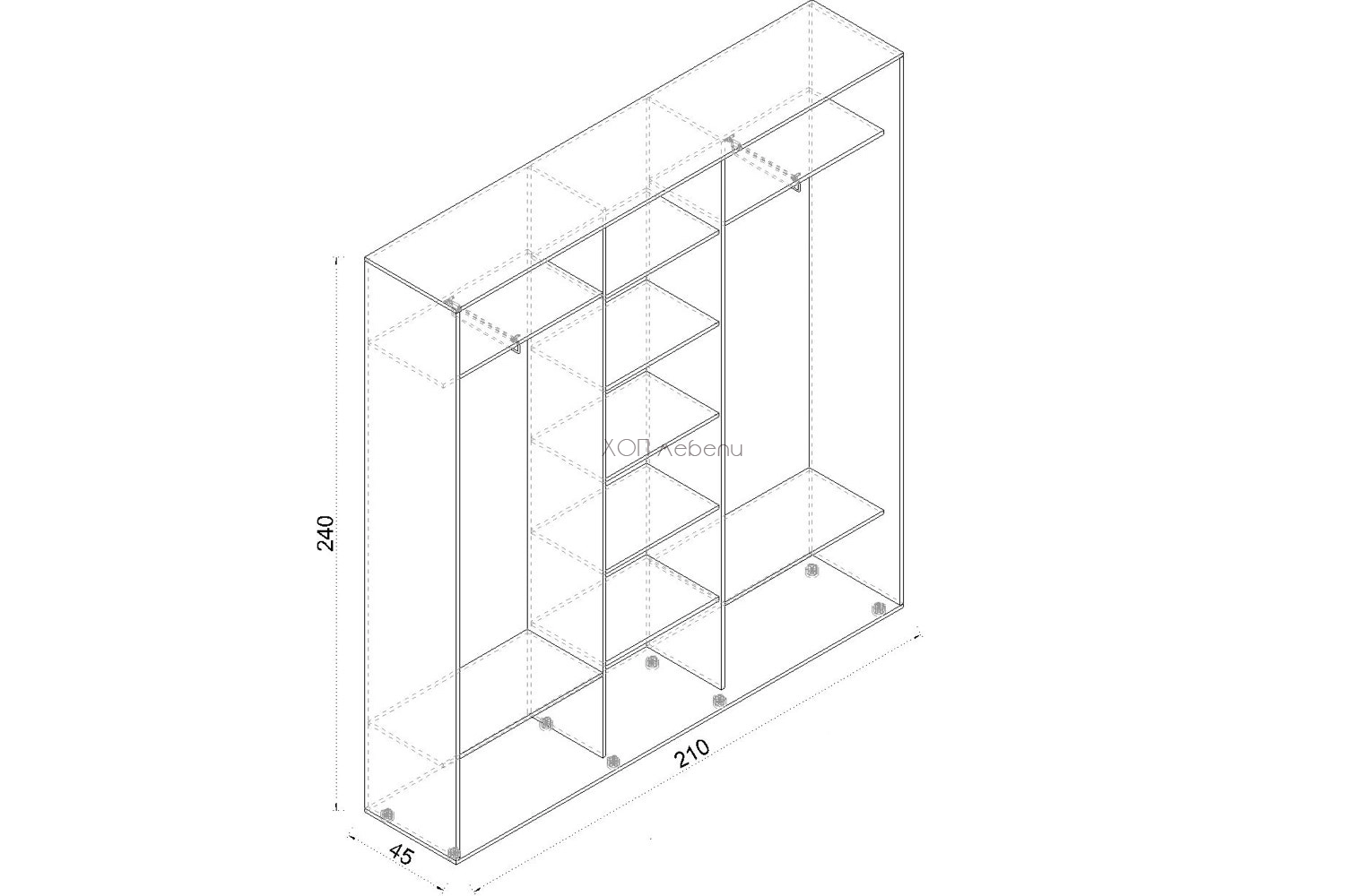 - височина 240 см / дълбочина 45 см / дължина 210 см