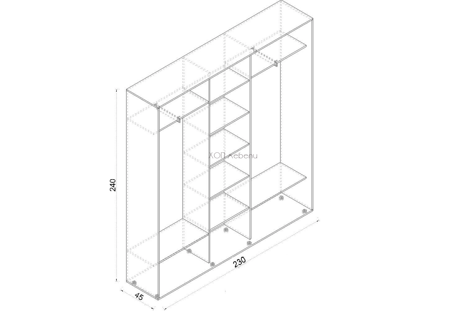 - височина 240 см / дълбочина 45 см / дължина 230 см
