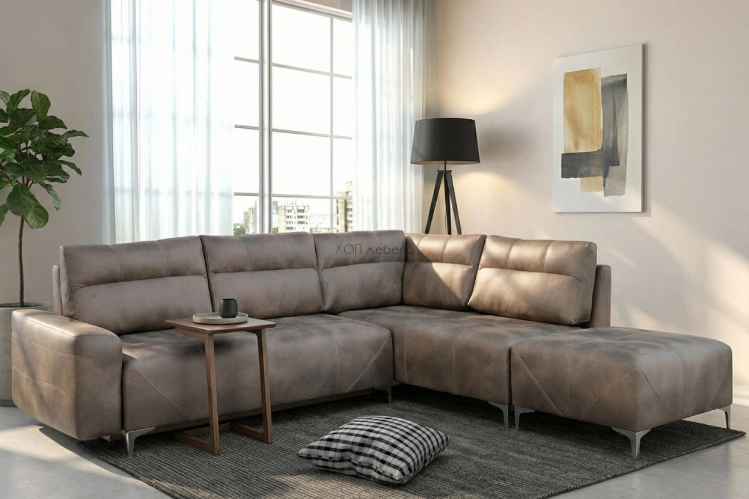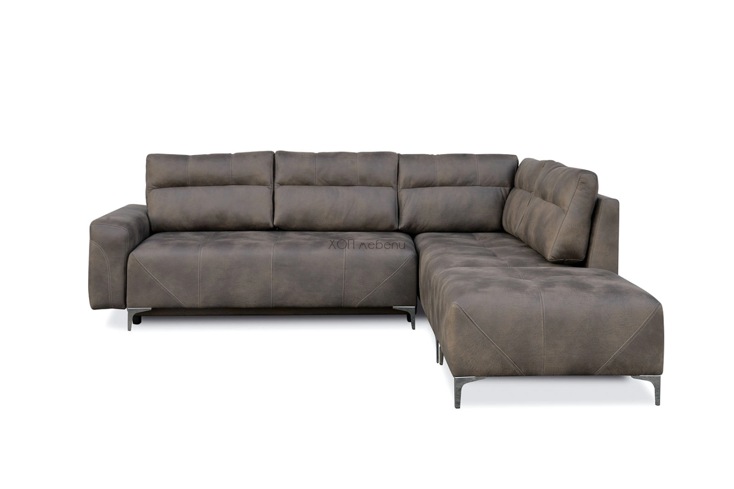 Тапициран ъгъл ПРЕСТО - голям и разкошен в дневната! Впечатляващо голям. С удобна, мека седалка - и за сядане, и за сън. Тапициран в луксозна дамаска. Има 5 големи възглавници и ракла под седалката. Има и голяма табуретка.