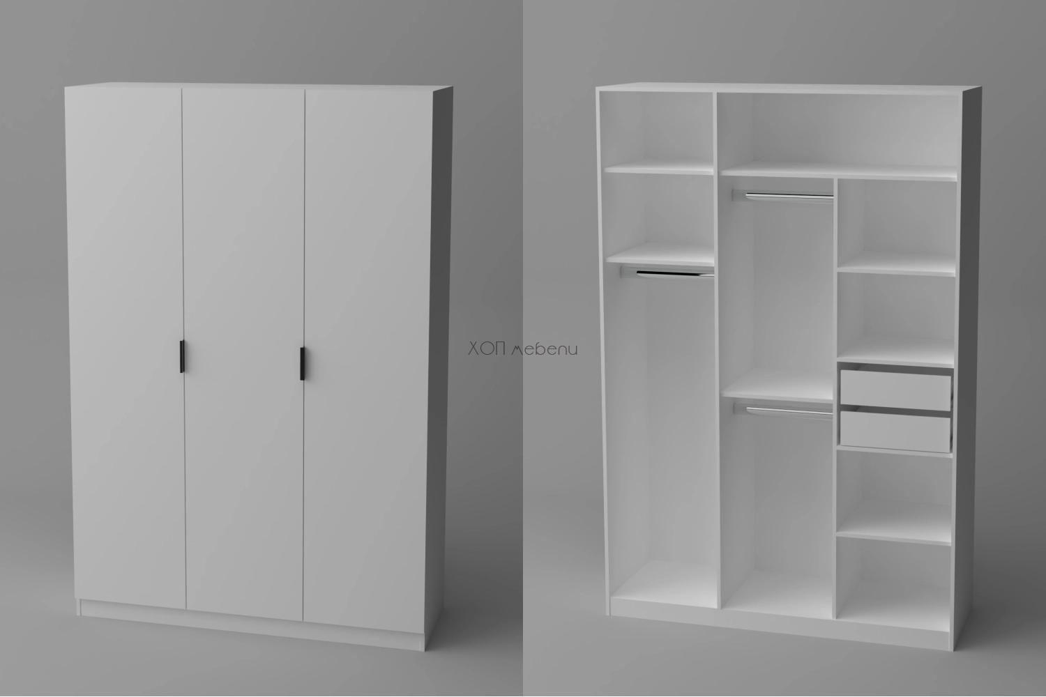 Гардероб с три врати, две чекмеджета, три лоста за закачалки и много рафтове за вашите дрехи. С лице и корпус в бяло, с модерни метални дръжки. Подходящ за спалнята, детската стая и коридора. Има достатъчно място както за сгънати дрехи, така и за дрехи на закачалки.