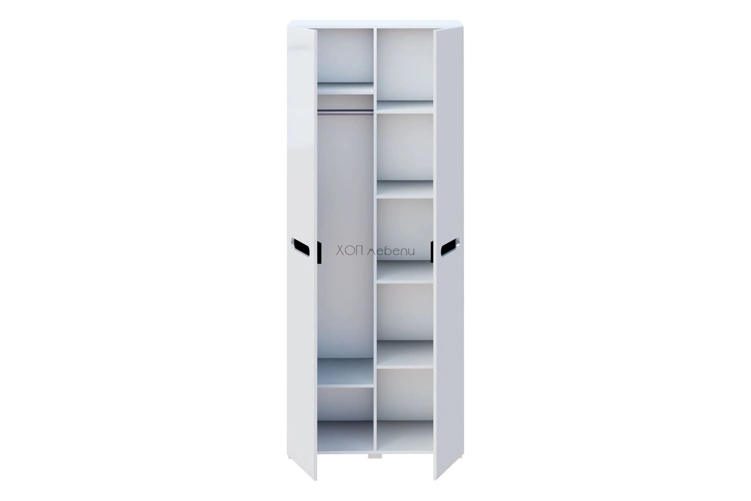 Гардероб с две врати, шест рафта и лост за закачалки. В бял гланц и черно, които разширяват визуално пространството и лесно кореспондират с всеки интериор.