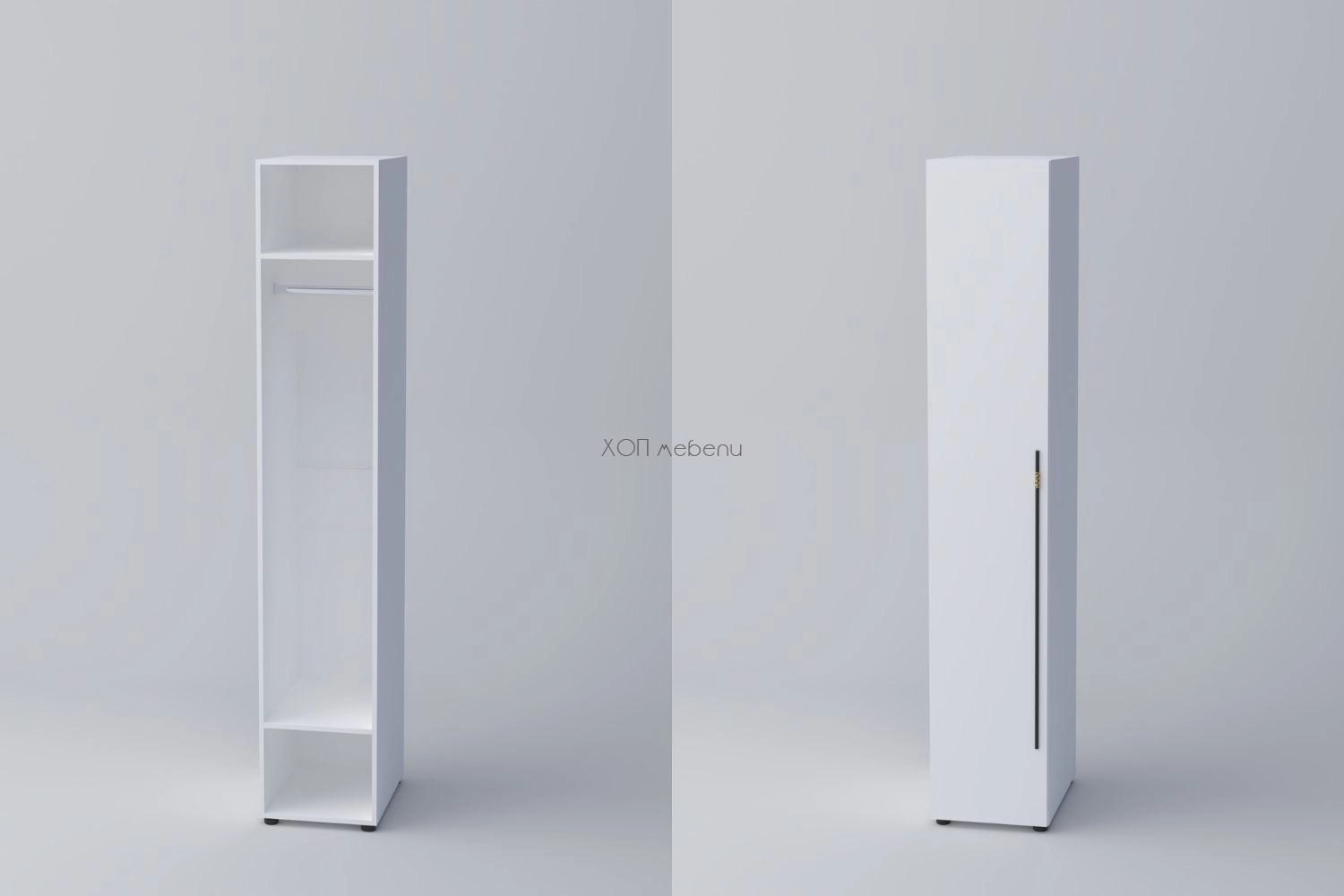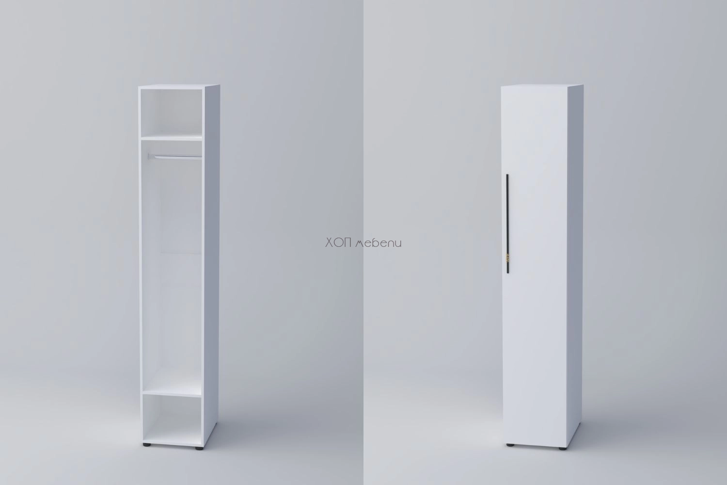 Еднокрилен гардероб СПЕЙС 1 с височина 220 см. и ширина 40 см. Удобно разпределение и компактни размери. Гардеробът разполага с един лост за закачалки и два рафта. Изцяло в класически бял цвят.