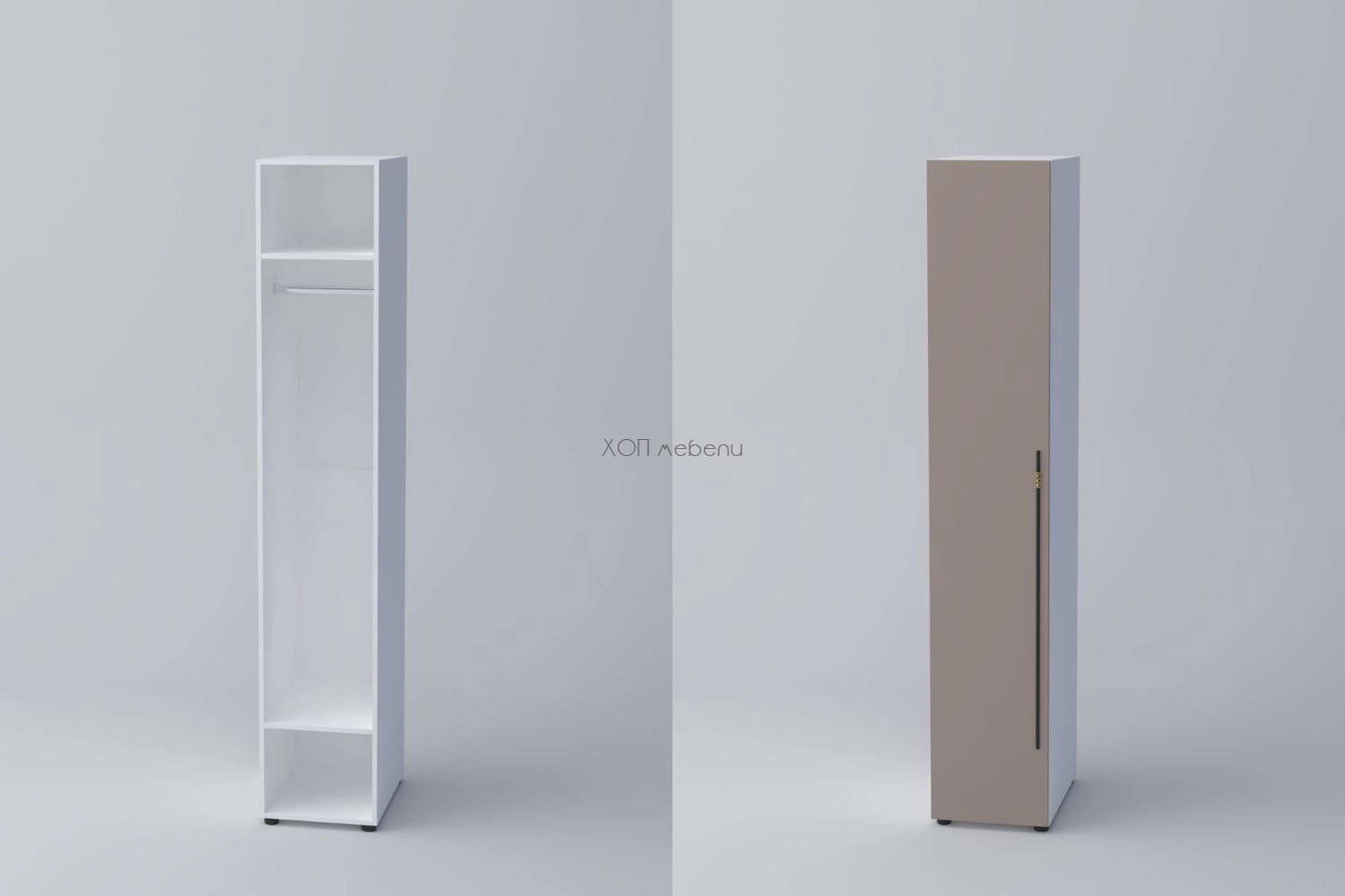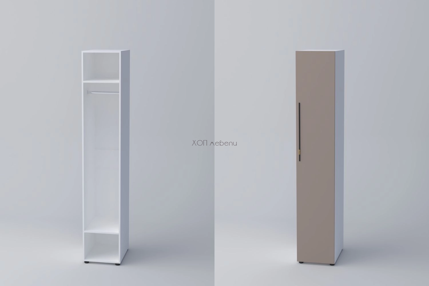 Еднокрилен гардероб СПЕЙС 1 с височина 220 см. и ширина 40 см. Удобно разпределение и компактни размери. Гардеробът разполага с един лост за закачалки и два рафта.
