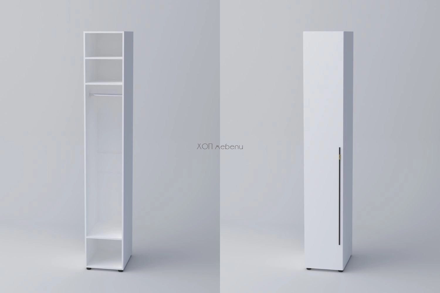 Еднокрилен гардероб СПЕЙС 1 с височина 240 см. и ширина 40 см. Удобно разпределение и компактни размери. Гардеробът разполага с един лост за закачалки и три рафта. Изцяло в класически бял цвят.