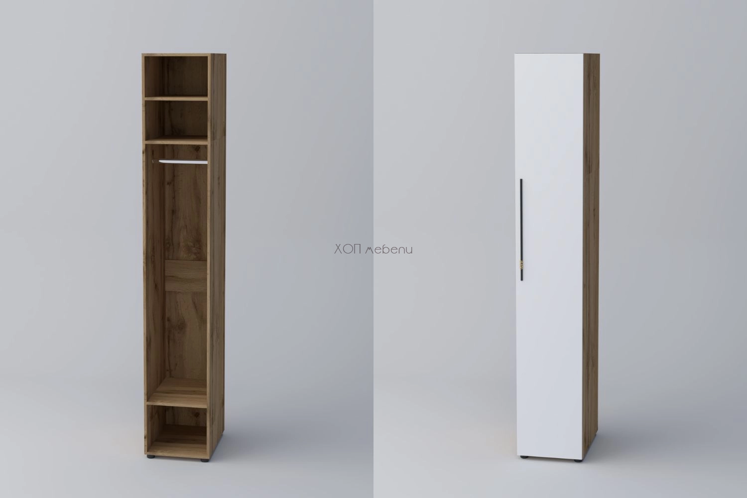Еднокрилен гардероб СПЕЙС 1 с височина 220 см. и ширина 40 см. Удобно разпределение и компактни размери. Гардеробът разполага с един лост за закачалки и три рафта.