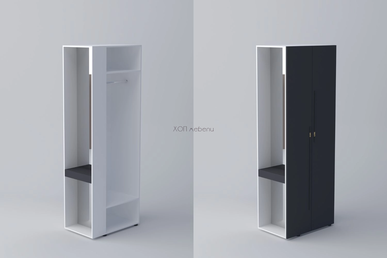 В предната си част шкафът разполага с две врати, лост за дрехи на закачалка и два рафта, а отстрани има чекмедже за козметика и дребни вещи. Практично разпределение, което позволява да се използва цялото пространство на модула.