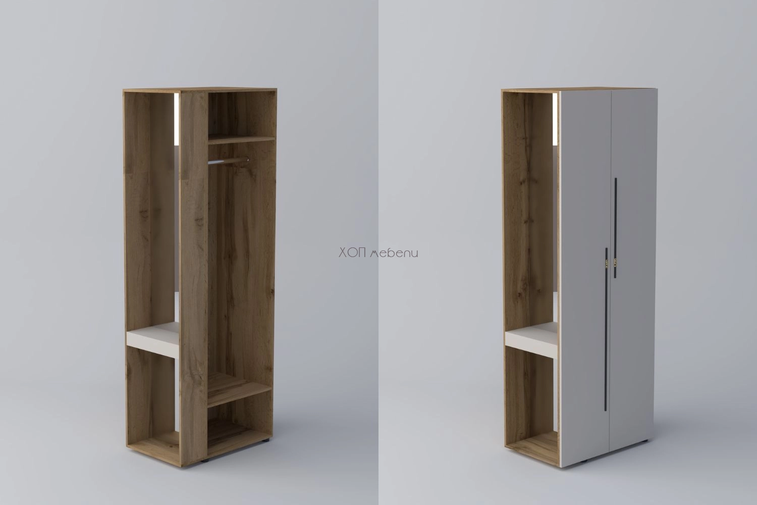 В предната си част шкафът разполага с две врати, лост за дрехи на закачалка и два рафта, а отстрани има чекмедже за козметика и дребни вещи. Практично разпределение, което позволява да се използва цялото пространство на модула.