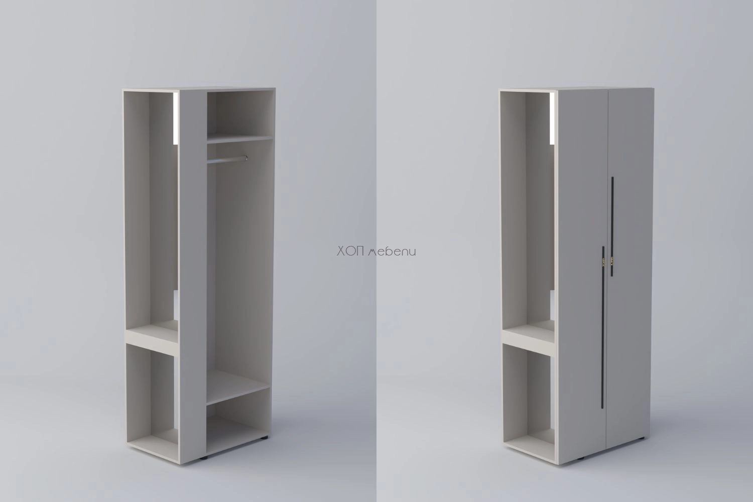 В предната си част шкафът разполага с две врати, лост за дрехи на закачалка и два рафта, а отстрани има чекмедже за козметика и дребни вещи. Практично разпределение, което позволява да се използва цялото пространство на модула.