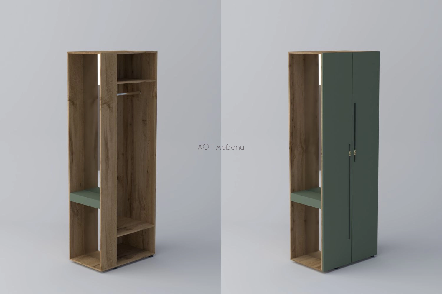 В предната си част шкафът разполага с две врати, лост за дрехи на закачалка и два рафта, а отстрани има чекмедже за козметика и дребни вещи. Практично разпределение, което позволява да се използва цялото пространство на модула.