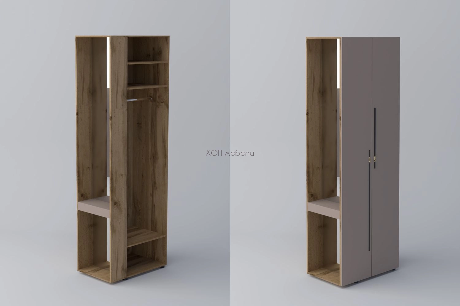 В предната си част шкафът разполага с две врати, лост за дрехи на закачалка и три рафта, а отстрани има чекмедже за козметика и дребни вещи. Практично разпределение, което позволява да се използва цялото пространство на модула.