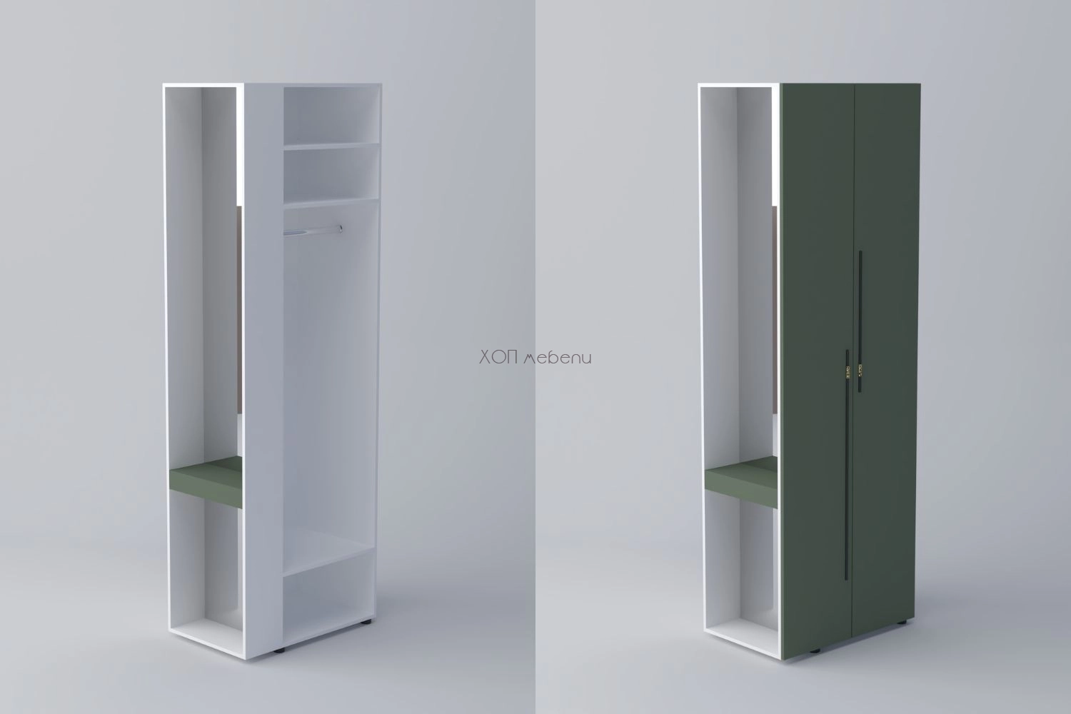 В предната си част шкафът разполага с две врати, лост за дрехи на закачалка и три рафта, а отстрани има чекмедже за козметика и дребни вещи. Практично разпределение, което позволява да се използва цялото пространство на модула.