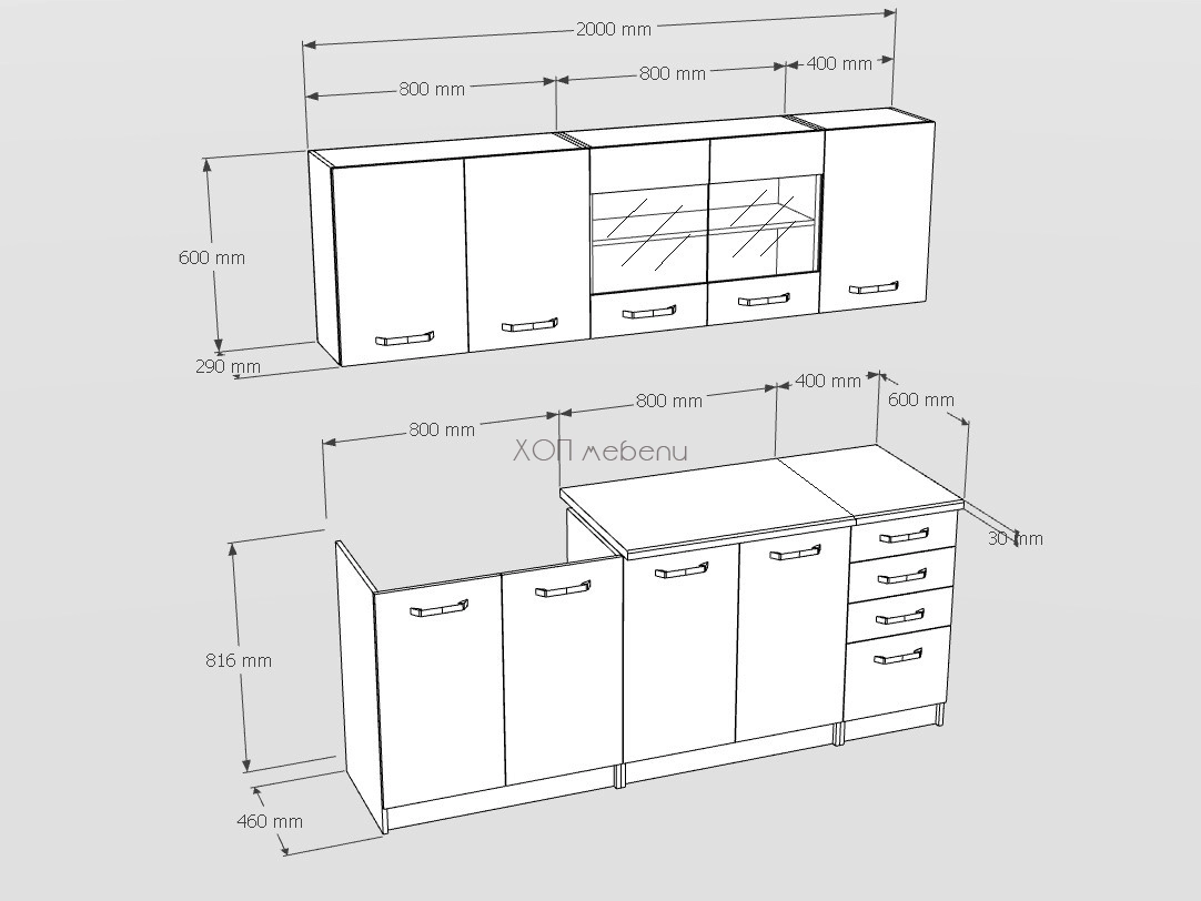 В цената е включен плот за шкаф 40 см и плот за единия шкаф 80 см.