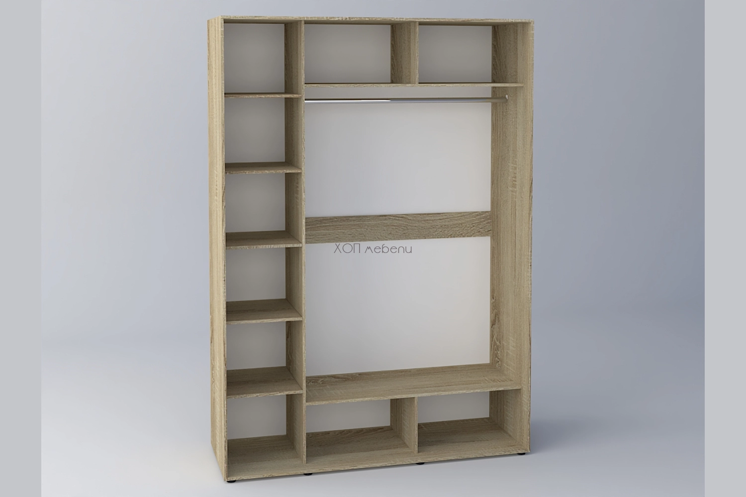 Модул за гардеробна Алфа в сонома с ширина 160 см. и по-големи височина и дълбочина. С лост за закачалки и много рафтове.