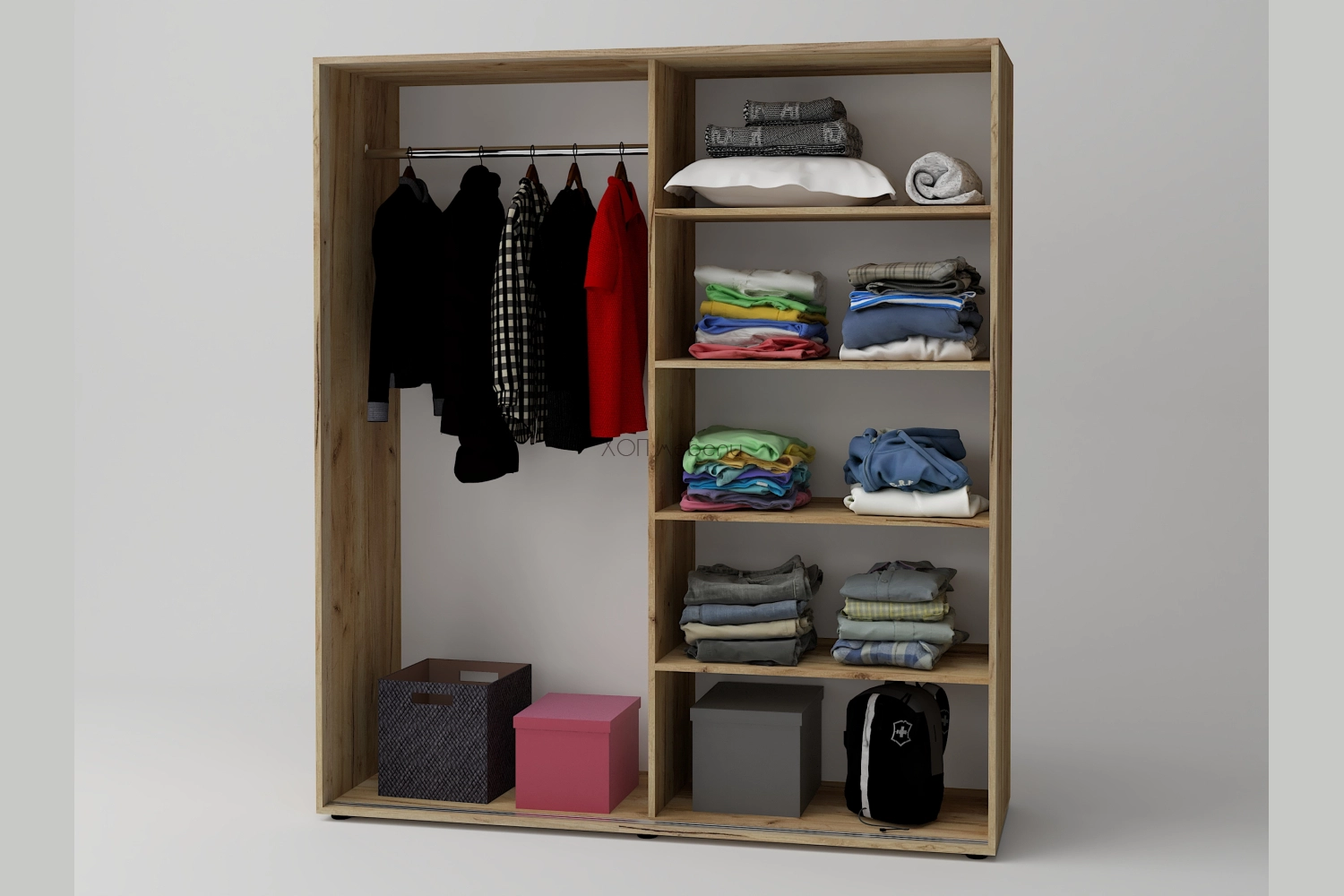 С лост за закачалки от едната страна и четири големи рафта от другата.