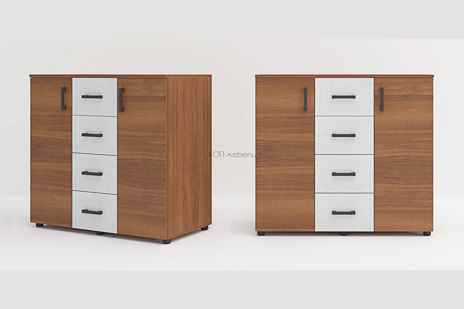 Голям скрин с две врати и четири чекмеджета Лена. С плавно затваряне на вратичките. В уютна комбинация от класически орех и лино бланко.