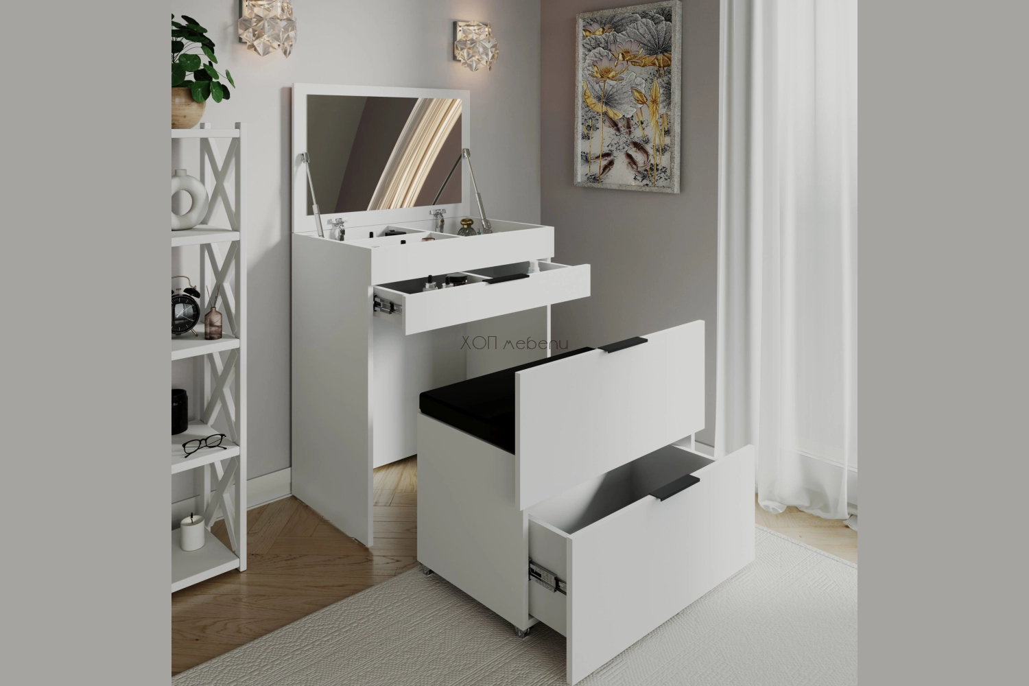 Тоалетка Лола е страхотна и практична ! Трансформира се лесно от компактен шкаф в тоалетка с табуретка . Има голямо шкафче, мека седалка, чекмедже, ниша за козметика и огледало.