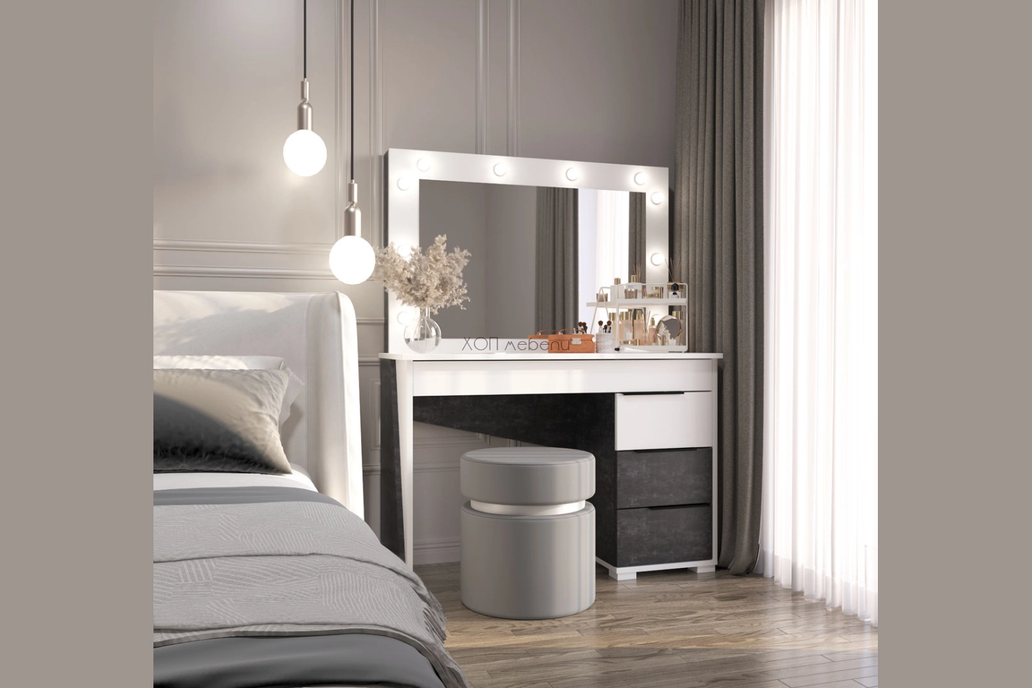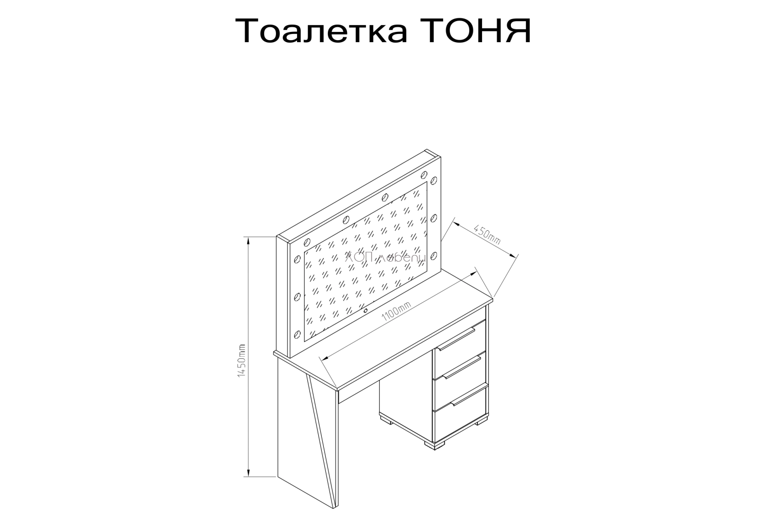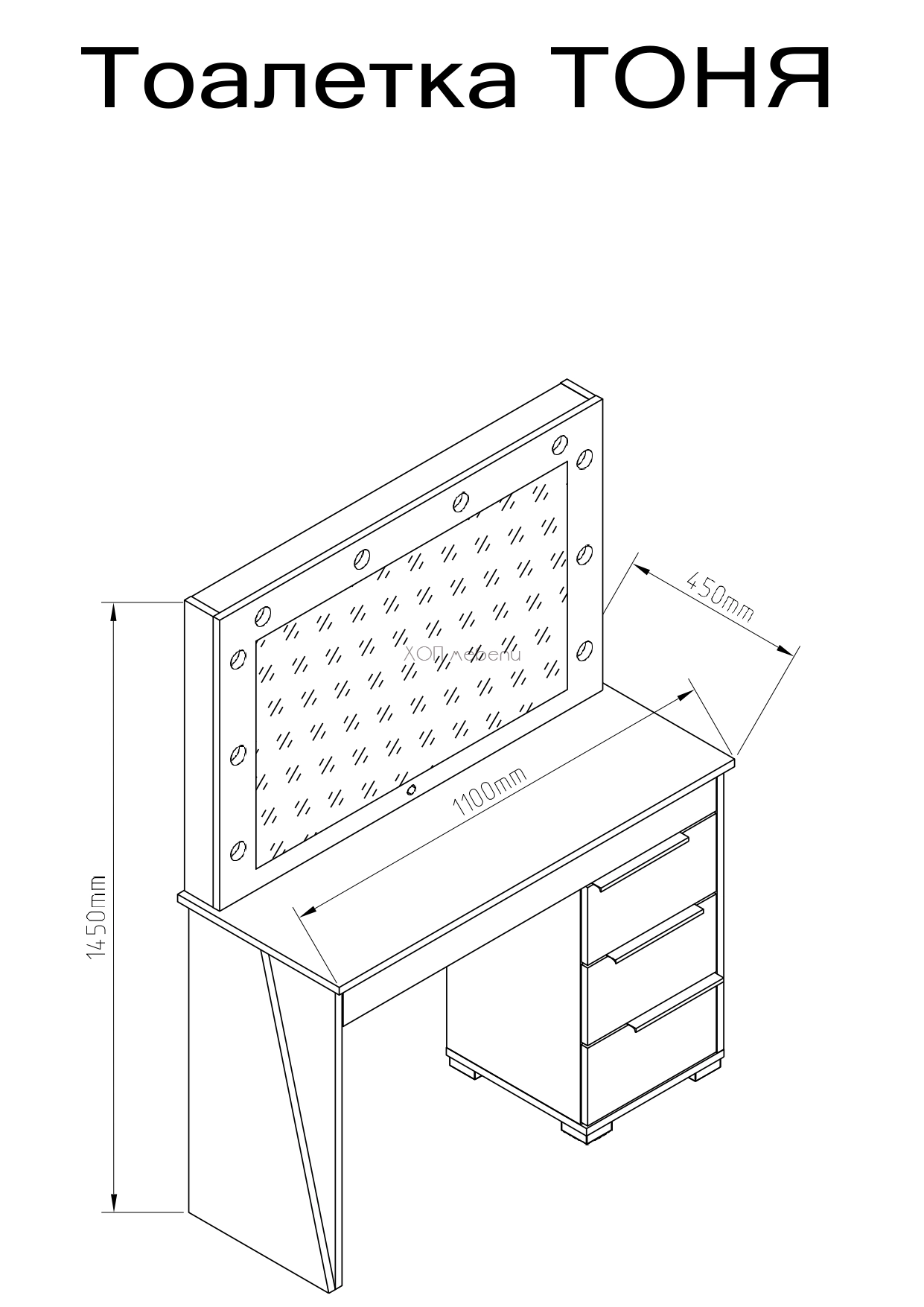 Тоалетка Тоня е голяма и практична ! Има три дълбоки чекмеджета,едно наистина дълго чекмедже, голям плот за козметика и огледало с осветление.