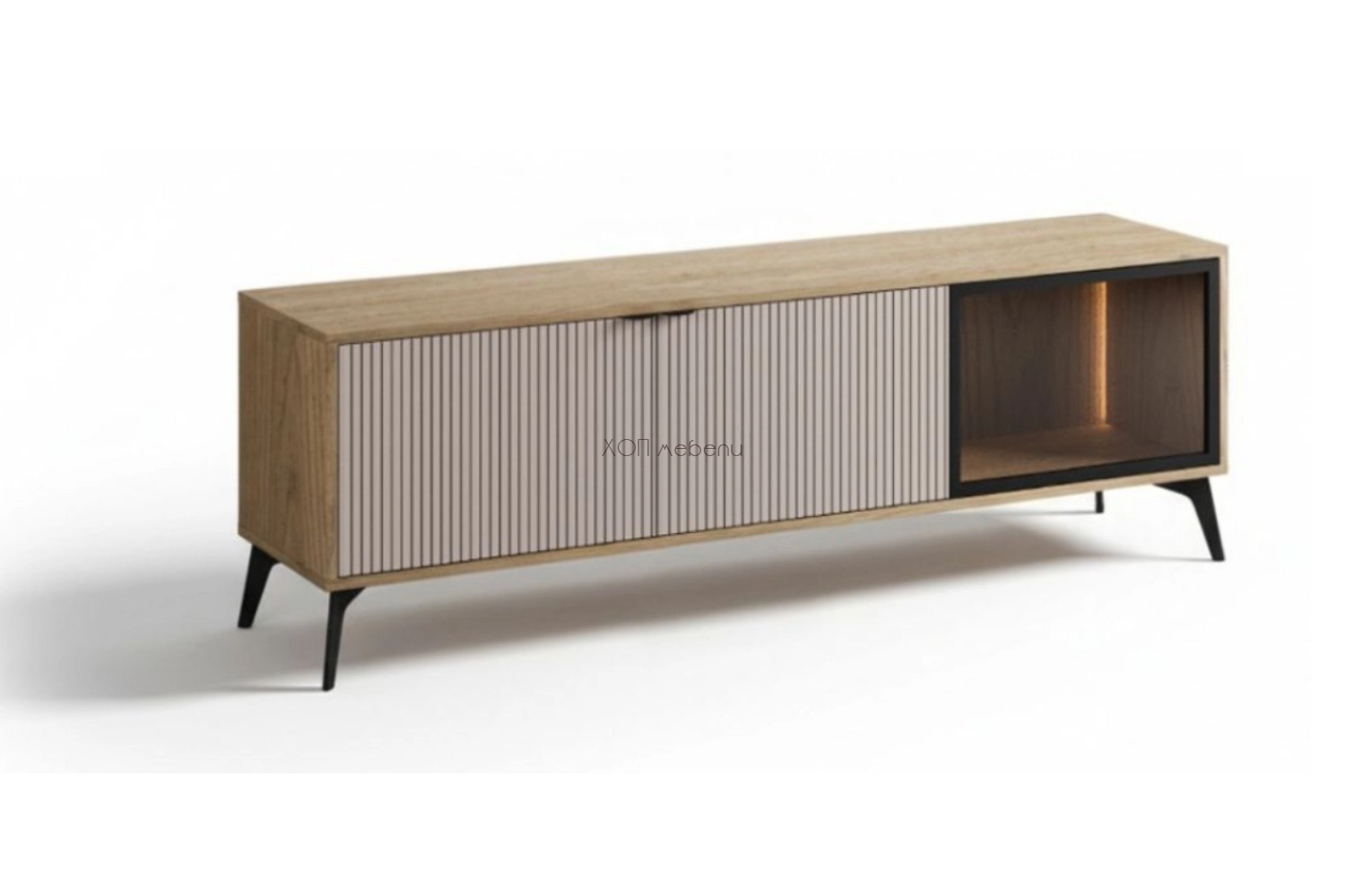 ТВ шкаф с витрина Лина в кремона и беж. Модерно и практично решение, с което ще имате много място за телевизор, мултимедия, дребни вещи и документи. Елегантно лице от релефен МДФ. Компактни размери, които са подходящи както за по-малки, така и за по-големи помещения.