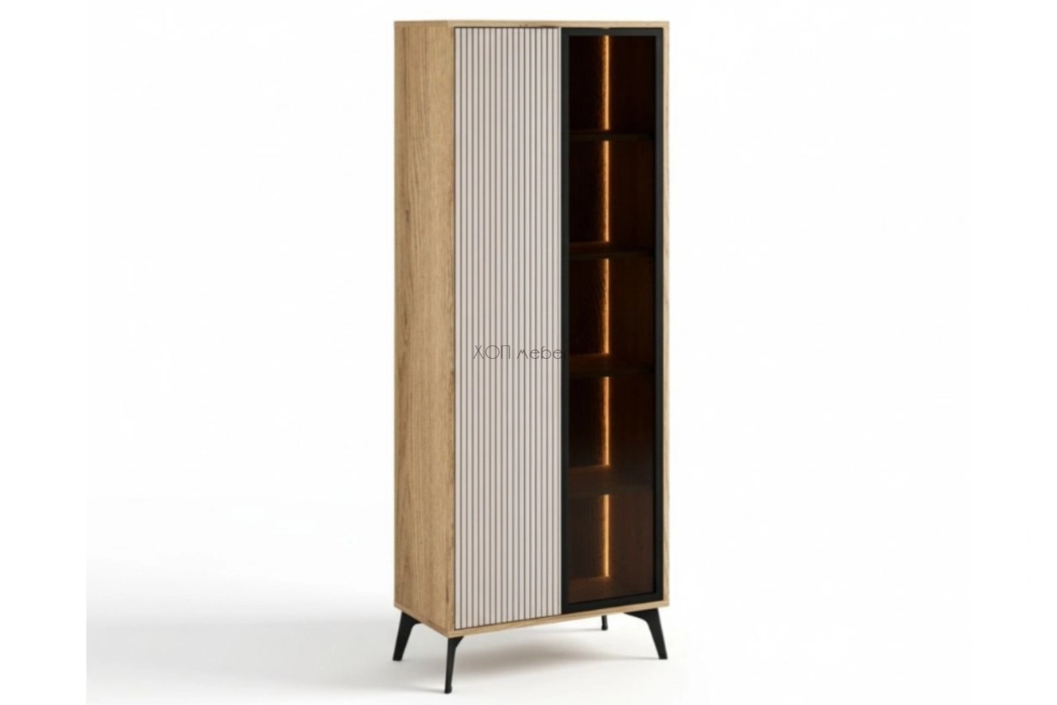 Висок шкаф с витрина Лина в кремона и беж. Модерно и практично решение, с което ще имате много място за книги, сервизи, дребни вещи, снимки и документи. Елегантно лице от релефен МДФ.