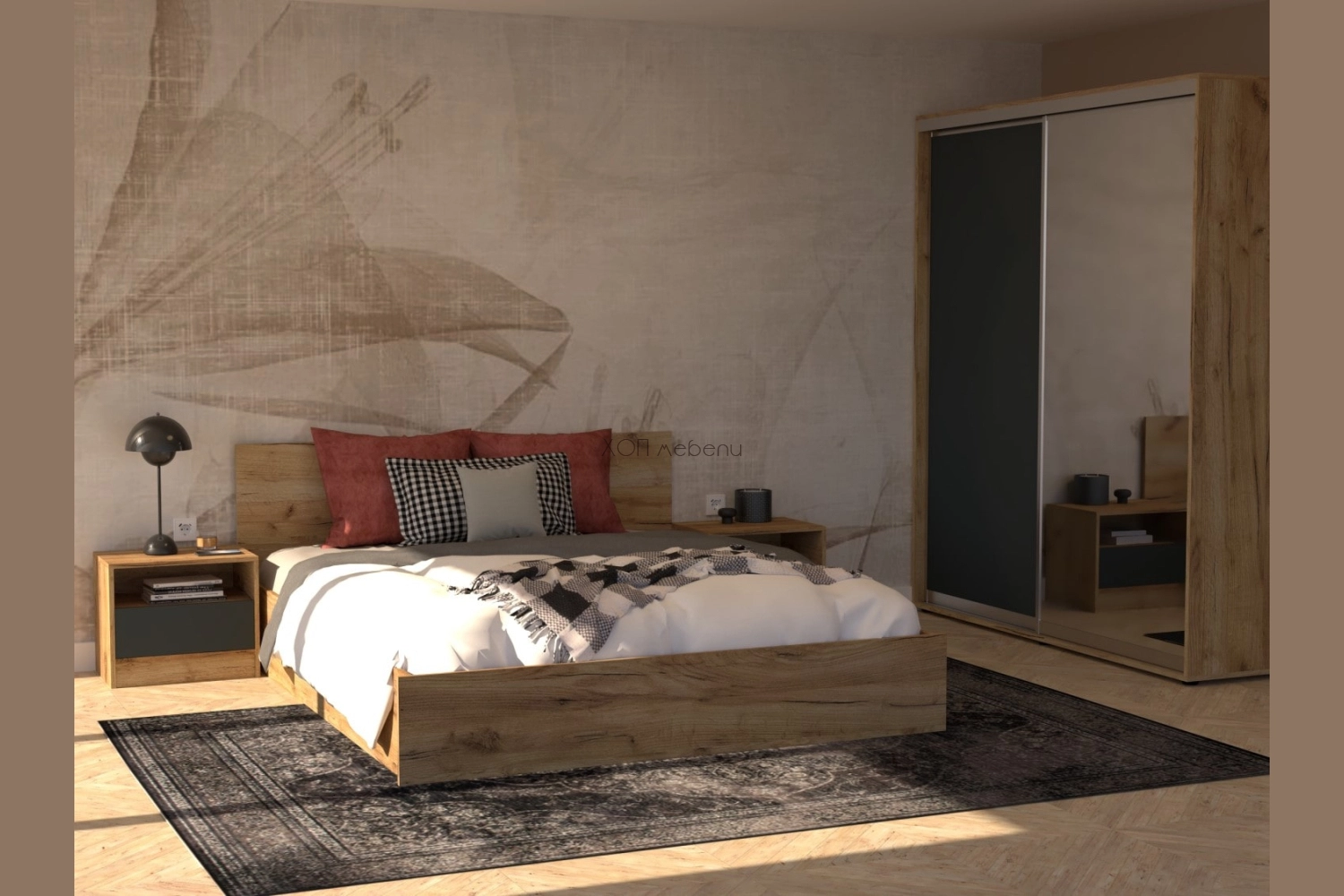 Дървесният декор придава топлина и уют на спалнята, а сивият цвят на антрацита е модерен акцент за всеки дом.